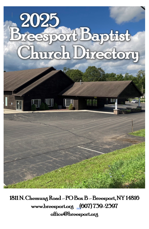 You can pick up your copy of the 2025 Breesport Baptist Church Directory at the Welcome Center, download a copy (password protected) HERE, or stop in the office during normal weekday business hours.